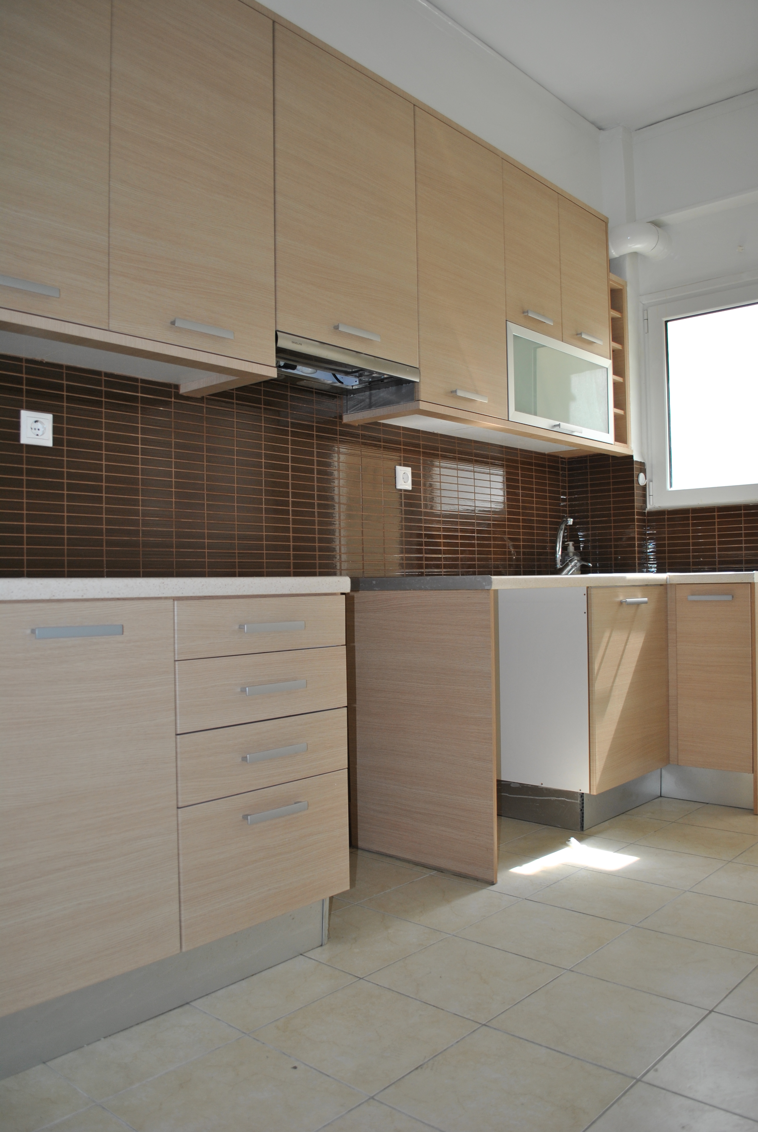Η κουζίνα του διαμερίσματος έχει ανακαινιστεί πλήρως (ηλεκτρολογικές και υδραυλικές εγκαταστάσεις) και φέρει βακελιτικά ντουλάπια, πλακάκια έχουν τοποθετηθεί τόσο στο δάπεδο όσο και στον καθρέπτη της κουζίνας.