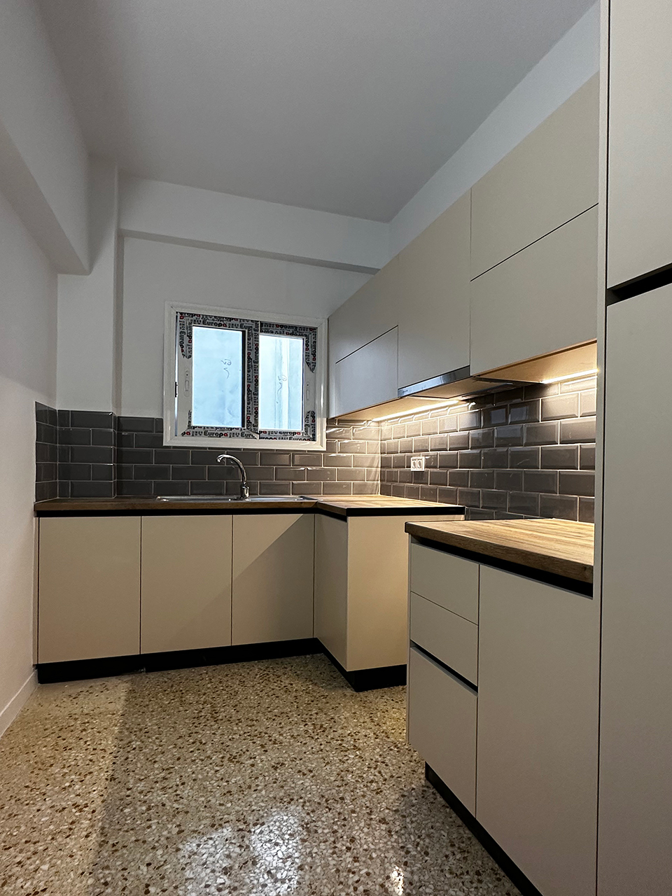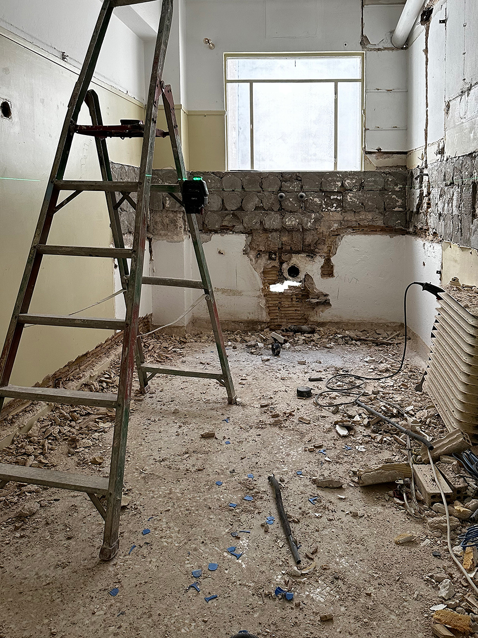 - Η διαδικασία ξεκίνησε με την πλήρη απομάκρυνση παλιών υλικών και εγκαταστάσεων, περιλαμβανομένων των παρωχημένων δαπέδων, κουζινικών επίπλων, και των υπάρχουσες ηλεκτρολογικές και υδραυλικές εγκαταστάσεις.